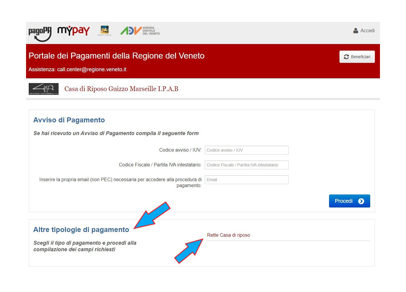 Una volta aperto il collegamento al portale dei pagamenti della Regione Veneto, cliccare su “Rette Casa di riposo” (Altre tipologie di pagamento).